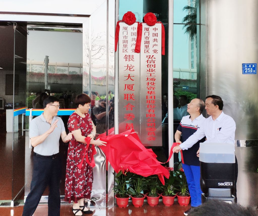 春夏之交,阳光明媚,万物生长,蓬勃盎然。在这美好的日子里,弘信集团双喜临门。经湖里街道党工委批准,中国共产党弘信集团委员会正式成立。同时,由弘信集团党委牵头组建的银龙大厦联合党委也获批成立。4月29日,揭牌仪式在银龙大厦一楼举行。厦门市委组织部副部长,市非公工委书记曾丽娟,湖里区委常委、组织部长胡鹏程与弘信集团董事长李强、党委书记付松立一起为弘信集团党委、银龙大厦联合党委牌匾揭下鲜红的缎带,弘信集团企业党建及银龙大厦楼宇党建由此揭开新篇章。